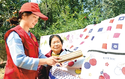 河北省邯鄲市肥鄉(xiāng)區(qū)人社局青年志愿者與老人一起晾曬被子嘮家常。胡清華攝(人民視覺)