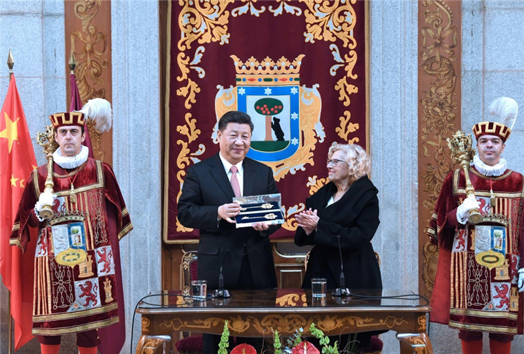 習(xí)近平在致辭中指出,很高興造訪馬德里并獲贈馬德里城市金鑰匙。這不僅是給予我個人的榮譽,更承載著西班牙人民對中國人民的友好情誼。希望這把鑰匙能進一步打開中西交往、人民友好的大門。