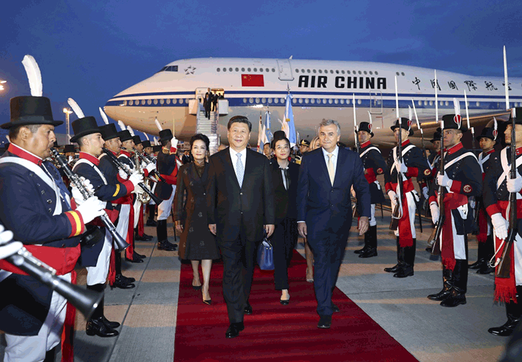當(dāng)?shù)貢r(shí)間20時(shí)05分許,習(xí)近平乘坐的專機(jī)抵達(dá)布宜諾斯艾利斯埃塞伊薩國際機(jī)場。習(xí)近平和夫人彭麗媛受到阿根廷外交部長福列、胡胡伊省省長莫拉萊斯等熱情迎接。儀仗隊(duì)長趨前致敬,軍樂團(tuán)奏響雄勁有力的進(jìn)行曲,習(xí)近平和彭麗媛沿紅地毯前行,禮兵分列紅地毯兩側(cè),行注目禮。