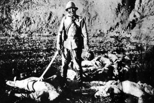 這個(gè)慘無(wú)人道的日本軍官在殺死人后,提著一個(gè)砍掉的腦袋的耳朵,洋洋得意地照相。
