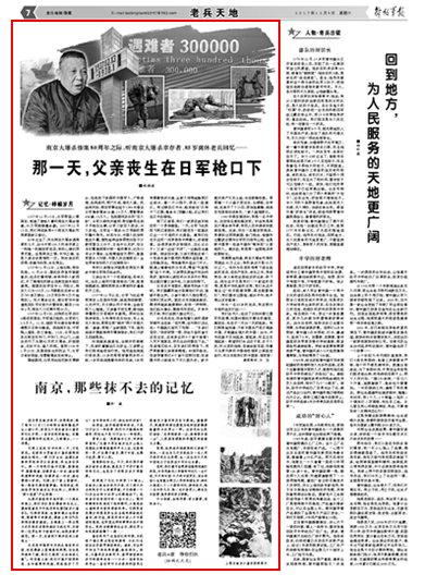 “80年過去了,作為南京大屠殺遇難者的兒子、如今不到100人的幸存者之一和唯一的解放軍老兵,我的心情仍異常沉重。這是南京之殤、中華之痛,也是人類歷史黑暗的一頁。我所親歷的恐懼、傷痛與仇恨,永生難忘。”請關注今日出版的《解放軍報》的文章——