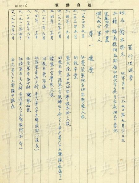 據(jù)鈴木啟久1954年7月筆供,他1890年生于日本福島縣,1934年到中國(guó)東北參加侵華戰(zhàn)爭(zhēng),任步兵第28聯(lián)隊(duì)長(zhǎng)輔佐,1945年4月任陸軍中將,第117師團(tuán)長(zhǎng)。同年8月31日在吉林被俘。