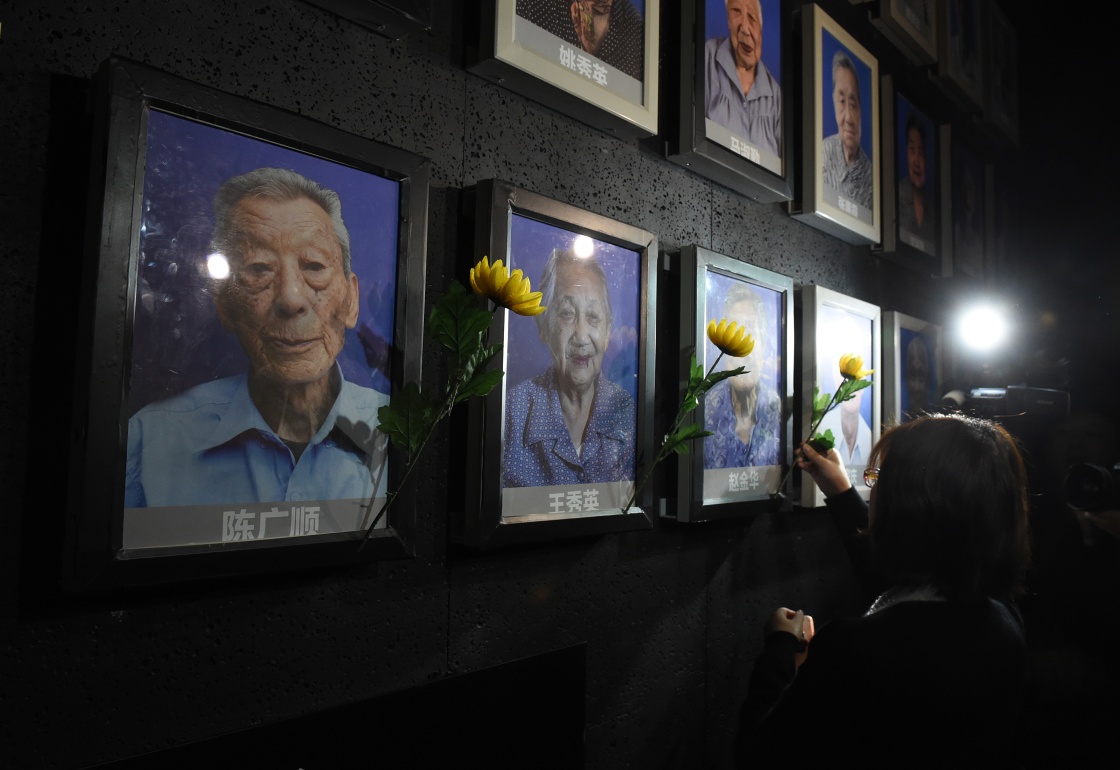 12月6日,侵華日軍南京大屠殺遇難同胞紀(jì)念館工作人員向大屠殺幸存者照片墻上的陳廣順、王秀英、趙金華遺像獻(xiàn)花。新華社記者孫參攝