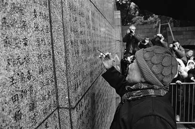 即使81年過去,我們也沒有放棄對過去的追問,呈現(xiàn)在眼前的是更為豐富飽滿的歷史敘事。“這是我母親”“這是我大姐、二姐”……幸存者夏淑琴在家人攙扶下,一筆一畫為刻入哭墻的遇難親人的名字描紅。