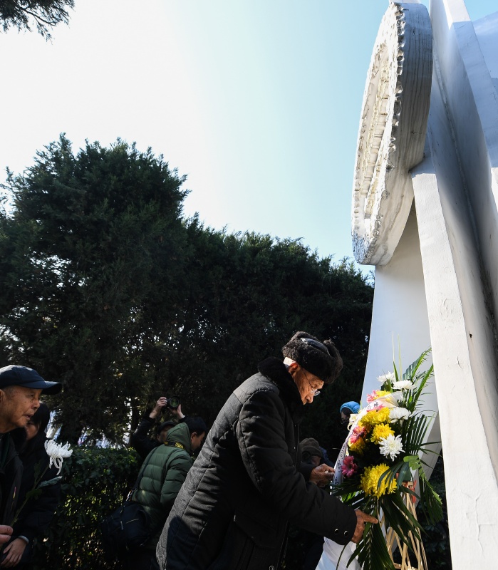 12月12日,抗戰(zhàn)老兵在侵華日軍南京大屠殺中山碼頭遇難同胞紀(jì)念碑前獻(xiàn)花。