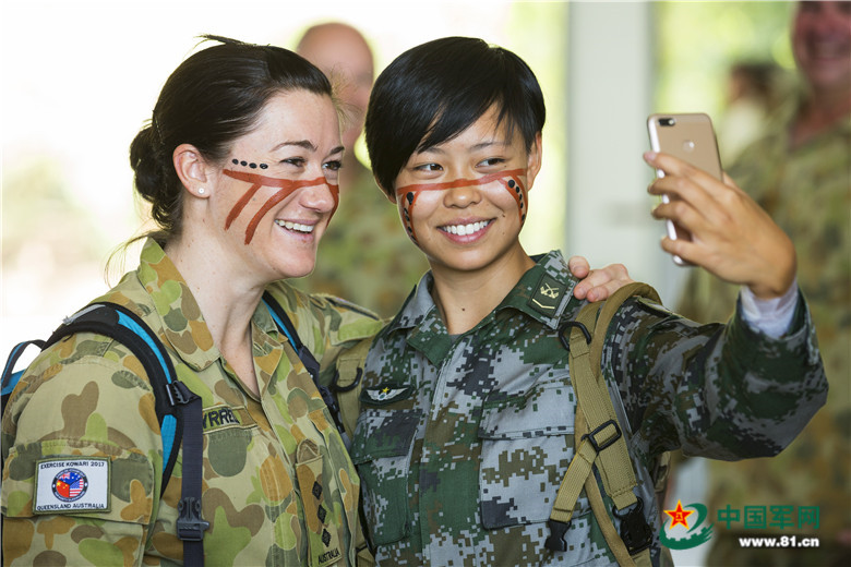 第75集團軍某特戰(zhàn)旅指揮通信連大學生女兵吳昌潔(右)在“科瓦里-2017”中美澳聯(lián)合訓練中與外軍合影。