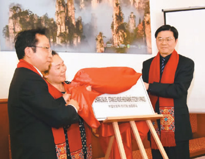 湖南省貿(mào)促會副會長傅丹舟(右)、張家界市政協(xié)副主席李文化(左)、捷克中歐通訊社社長王躍秋(中)為張家界(布拉格)絲路驛站揭牌。