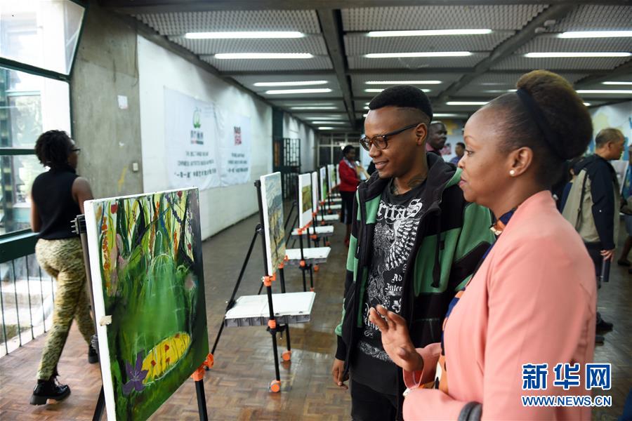 4月9日,在肯尼亞首都內羅畢,參觀者欣賞中國藝術家的繪畫作品。新華社記者李百順攝