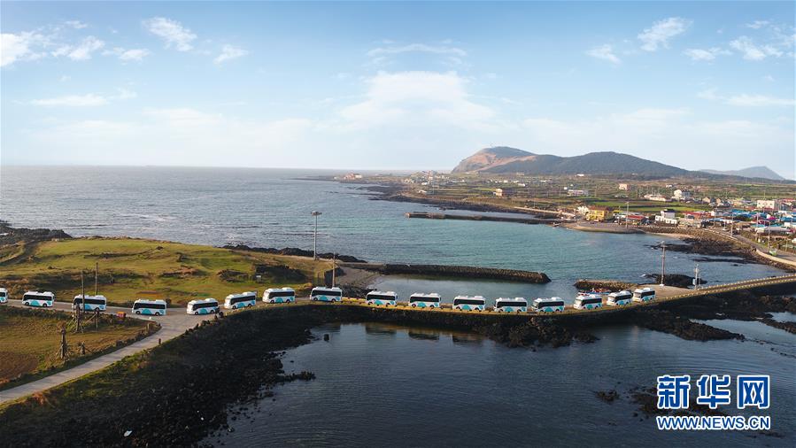 4月10日,在韓國濟州島的牛島景區(qū),比亞迪純電動巴士車隊在路上行駛。當日,20輛比亞迪eBus-7型純電動巴士在韓國濟州島的牛島景區(qū)交付運營,成為牛島的環(huán)島旅游巴士。 新華社發(fā)