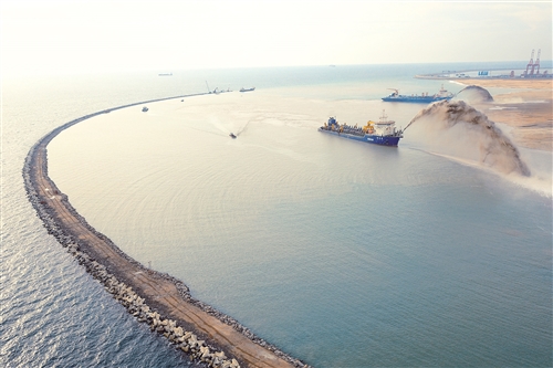 科倫坡港口城項目是中國與斯里蘭卡在“一帶一路”建設中的重點合作項目,由斯里蘭卡政府和中國港灣科倫坡港口城有限責任公司聯(lián)合開發(fā),于2014年9月動工,整體開發(fā)時間約25年。圖為吹沙船在科倫坡港口城項目上進行疏浚吹填作業(yè)。(圖片來源:新華社)