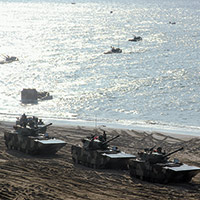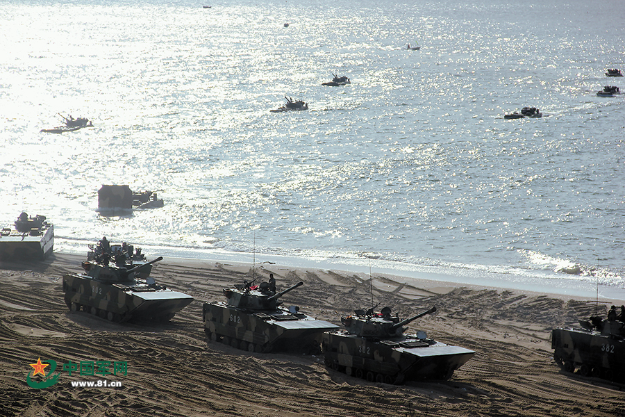 1月4日,新年開訓(xùn),第74集團(tuán)軍某旅組織實(shí)戰(zhàn)化條件下綜合演練。圖為裝甲分隊(duì)進(jìn)行下海登陸訓(xùn)練。張凱飛攝