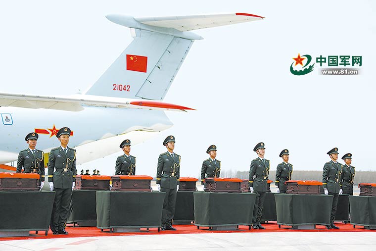 3月28日,20具裹覆著五星紅旗的志愿軍烈士遺骸,在解放軍空軍戰(zhàn)斗機(jī)護(hù)送下,由大型軍用運(yùn)輸機(jī)運(yùn)送回國。20名身著軍禮服的解放軍軍官,一路護(hù)送前往烈士陵園安葬。在場見證的軍人、記者無不動(dòng)情,潸然淚下。