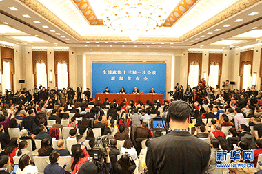 全國政協(xié)十三屆一次會議新聞發(fā)布會3月2日16:30在人民大會堂一層新聞發(fā)布廳召開,大會新聞發(fā)言人王國慶向中外媒體介紹本次大會有關(guān)情況并回答記者提問。圖為大會新聞發(fā)言人王國慶介紹有關(guān)情況。新華網(wǎng)/中國政府網(wǎng) 陳杰 攝