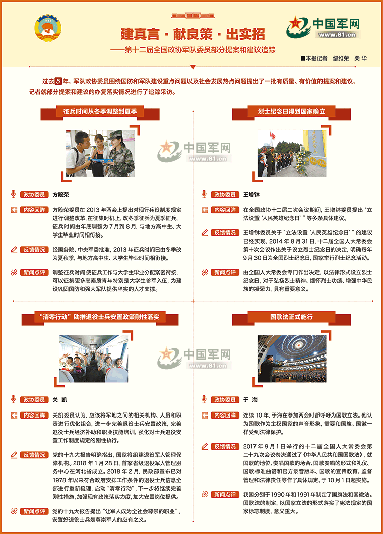 過去5年,軍隊政協(xié)委員圍繞國防和軍隊建設(shè)重點問題提出了一批有質(zhì)量、有價值的提案和建議,這些提案和建議的辦復(fù)落實情況如何?軍報記者就此進行了追蹤采訪。請關(guān)注今日出版的《解放軍報》帶來的詳細報道: