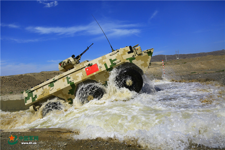 8月9日,“晴空”項目比賽中,中國隊步戰(zhàn)車沖出涉水場。張永進 攝