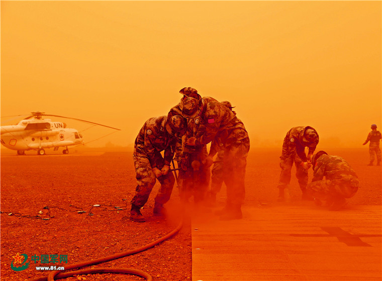 中國赴馬里維和工兵分隊(duì)在風(fēng)沙中修建加奧機(jī)場防御設(shè)施。駐馬團(tuán)東站區(qū)最高行政長官哈提姆贊譽(yù)“中國工兵不愧為駐馬團(tuán)典范”。趙佳明 攝