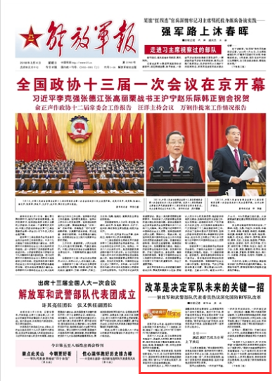 習(xí)主席反復(fù)強調(diào),“深化國防和軍隊改革是實現(xiàn)中國夢、強軍夢的時代要求,是強軍興軍的必由之路,也是決定軍隊未來的關(guān)鍵一招”,并親自掌舵指揮,繪制了改革強軍的清晰路線圖,堅定不移推進國防和軍隊改革。