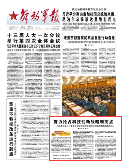 3月12日,習(xí)主席在出席解放軍和武警部隊(duì)代表團(tuán)全體會(huì)議時(shí)強(qiáng)調(diào),要密切關(guān)注世界軍事科技和武器裝備發(fā)展動(dòng)向,突出抓好重點(diǎn)領(lǐng)域軍民科技協(xié)同創(chuàng)新,推動(dòng)重大科技項(xiàng)目一體論證和實(shí)施,努力搶占科技創(chuàng)新戰(zhàn)略制高點(diǎn)。對(duì)此,解放軍和武警部隊(duì)代表委員聯(lián)系國防和軍隊(duì)建設(shè)實(shí)際,進(jìn)行了深入學(xué)習(xí)討論。請(qǐng)關(guān)注今日出版的《解放軍報(bào)》的詳細(xì)報(bào)道——