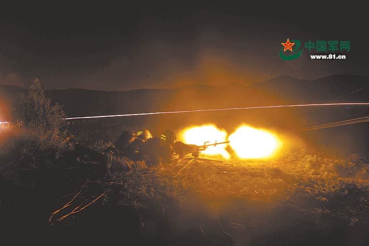 “一發(fā)裝填,發(fā)射!”隨著迫擊炮班長馬立強一聲令下,“敵”前沿陣地瞬間亮如白晝,官兵們借著光亮迅速搜索目標。