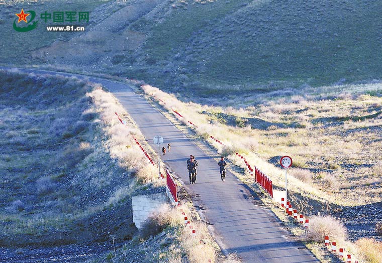 新疆軍區(qū)丘爾丘特邊防連季節(jié)性哨所官兵在邊防公路上進行體能訓練。趙永峰攝