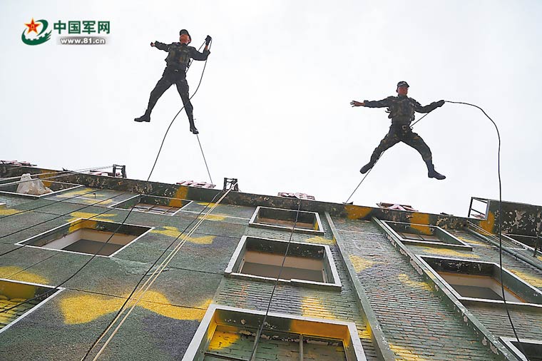 特戰(zhàn)隊(duì)員使用“大”字飛撲的方式躍下攀登樓。