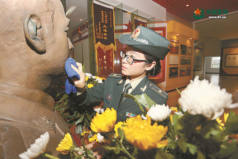 陳勤深情擦拭軍史館里哥哥的銅像。