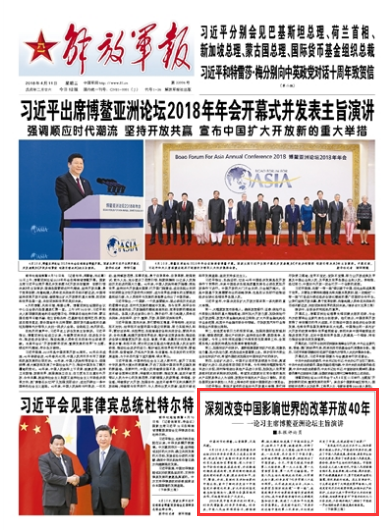 4月10日上午,習主席在博鰲亞洲論壇2018年年會開幕式上發(fā)表主旨演講,深刻總結了我國40年來改革開放的巨大成就和寶貴經(jīng)驗。請關注今日《解放軍報》的報道——
