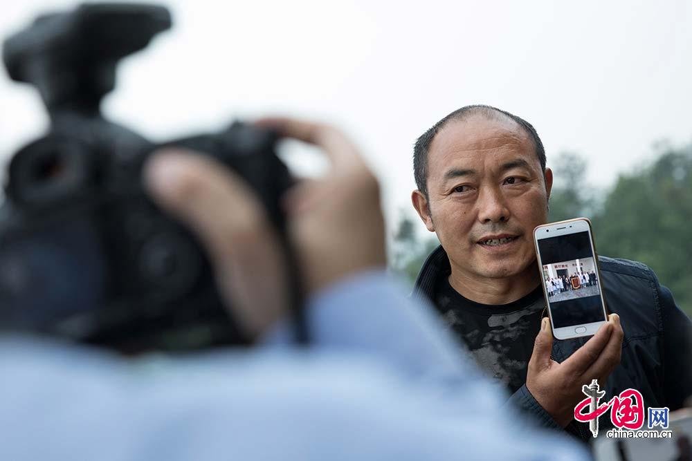 5月4日,“最牛礦工”彭國華向記者展示自己與當(dāng)年“救命恩人”的合影。 中國網(wǎng)記者 張若夢 攝