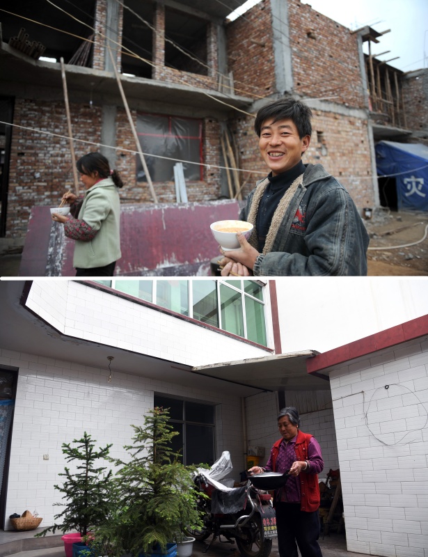 這是一張拼版照片,上圖為2008年11月21日,感恩村村民李旭德(右)在自家正在建設(shè)的二層小樓房前吃午飯(新華社記者 聶建江 攝);下圖為2018年5月9日,感恩村村民李旭德的母親在家中院落干活(新華社記者 范培珅 攝)。