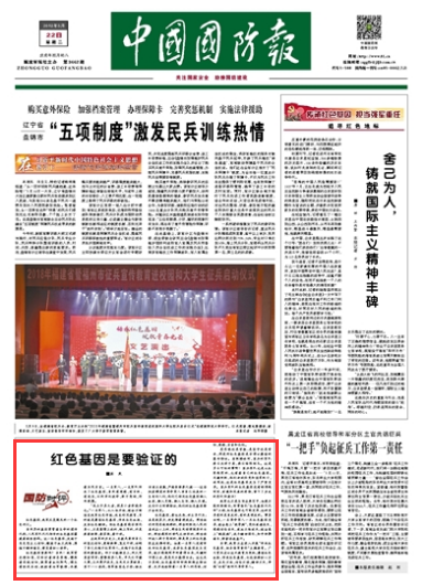 在我軍的歷史上,無數(shù)先輩用自己的堅定信仰、果斷抉擇、篤定行動,證明了自己無愧于紅軍傳人,無愧于紅色基因的賡續(xù)者。紅色基因時時刻刻都在驗證著,無聲地檢驗著一名軍人的忠誠、信仰、理想、宗旨和品性。紅色基因能否固化身心,不是靠嘴上說的、紙上寫的,而是要看抉擇、看實踐、看行動。請關注今天出版的《中國國防報》的報道——