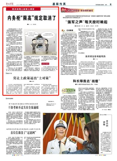 會后,許連長擬制了一份新的內(nèi)務(wù)設(shè)置方案,并呈送到機關(guān)。沒想到,機關(guān)很快進行了反饋:內(nèi)務(wù)柜取消“限高”規(guī)定,擺放整齊即可,不追求絕對統(tǒng)一。