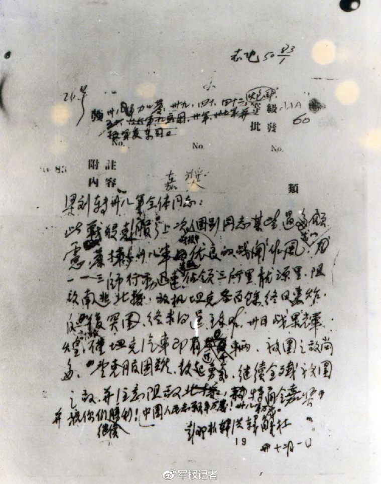此戰(zhàn)役克服了上次戰(zhàn)役中個(gè)別同志某些過(guò)多顧慮,發(fā)揮了三十八軍優(yōu)良的戰(zhàn)斗作風(fēng),尤以—一三師行動(dòng)迅速,先敵占領(lǐng)了三所里、龍?jiān)蠢铮钄衬咸颖痹硻C(jī)坦克各百余終日轟炸,反復(fù)突圍,終未得逞。至昨(30日)戰(zhàn)果輝煌,計(jì)繳僅坦克汽車即近千輛,被圍之?dāng)成卸唷M朔щy,鼓起勇氣,繼續(xù)全殲被圍之?dāng)常⒆⒁庾钄潮痹赝罴为?jiǎng),并祝你們繼續(xù)勝利!中國(guó)人民志愿軍萬(wàn)歲!三十八軍萬(wàn)歲!”