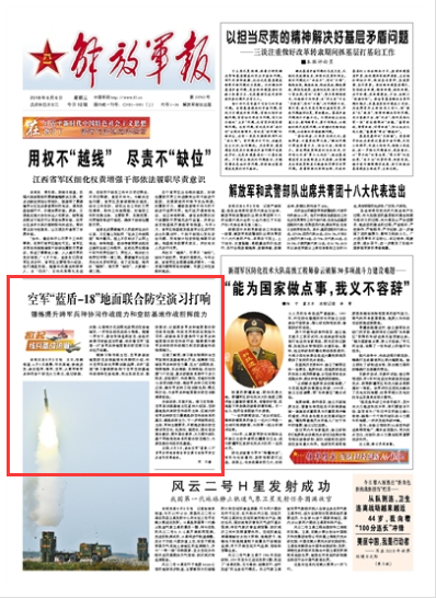 6月5日凌晨,華北某地,鐵流進(jìn)發(fā),來(lái)自陸軍、海軍、空軍、火箭軍等軍兵種的多個(gè)防空火力單元,經(jīng)過(guò)鐵路、水路、公路等方式遠(yuǎn)程機(jī)動(dòng)到達(dá)任務(wù)地域后,一次性全部完成戰(zhàn)斗準(zhǔn)備。隨著一聲令下,數(shù)枚導(dǎo)彈直刺夜空,多批次來(lái)襲目標(biāo)被成功攔截,標(biāo)志著空軍“藍(lán)盾-18”多軍兵種地面聯(lián)合防空演習(xí)由此拉開(kāi)戰(zhàn)幕。請(qǐng)關(guān)注今日出版的《解放軍報(bào)》的詳細(xì)報(bào)道——