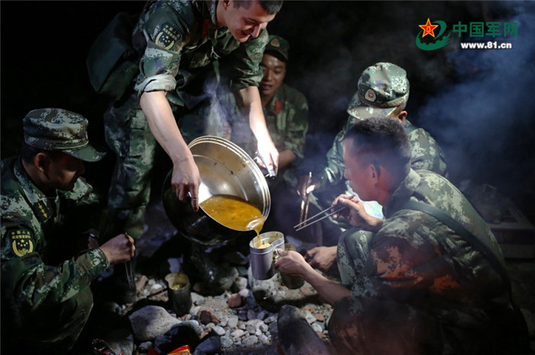 伊馬木和戰(zhàn)友結(jié)束了一天的巡邏在山間宿營,才吃上一口熱飯。