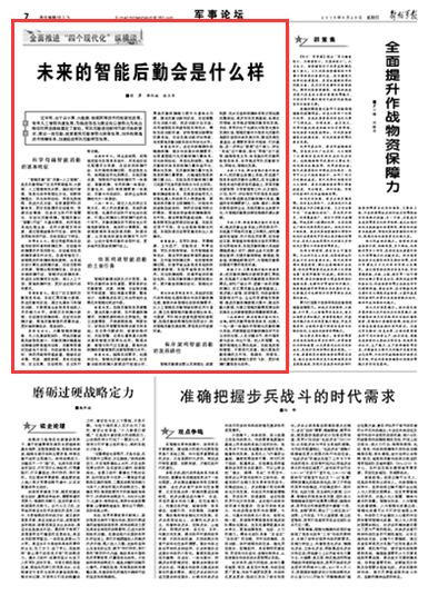 近年來(lái),由于云計(jì)算、大數(shù)據(jù)、物聯(lián)網(wǎng)等技術(shù)的突破性進(jìn)展,帶來(lái)人工智能快速發(fā)展,為推進(jìn)信息化建設(shè)向以智能化為突出特征的轉(zhuǎn)進(jìn)跨越奠定了基礎(chǔ)。軍隊(duì)后勤適應(yīng)新時(shí)代新任務(wù)新要求,建設(shè)一流后勤,就要重視后勤智能化裝備發(fā)展,加快構(gòu)建高技術(shù)保障體系,加速促進(jìn)軍隊(duì)后勤轉(zhuǎn)型發(fā)展。請(qǐng)關(guān)注今日出版的《解放軍報(bào)》的文章——