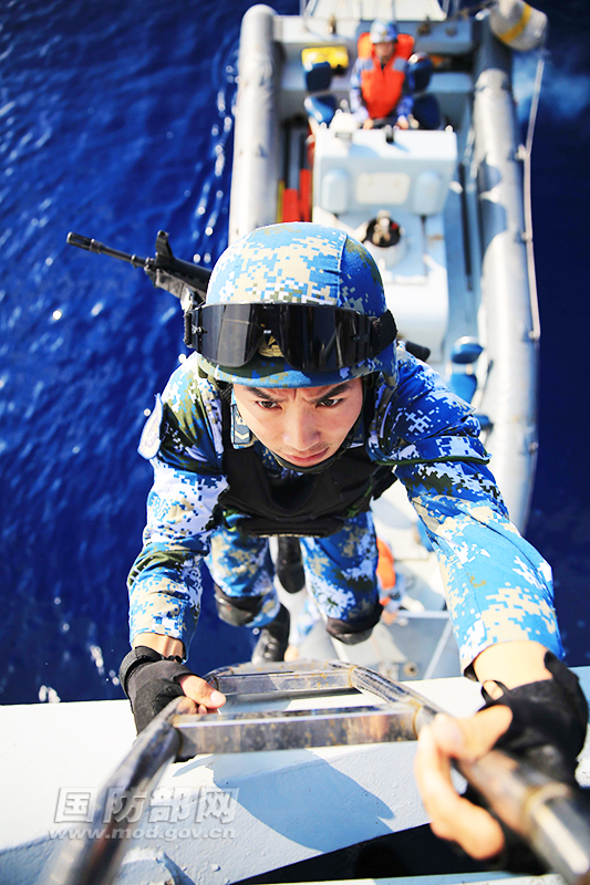 特戰(zhàn)隊(duì)員乘小艇進(jìn)行攀爬訓(xùn)練。