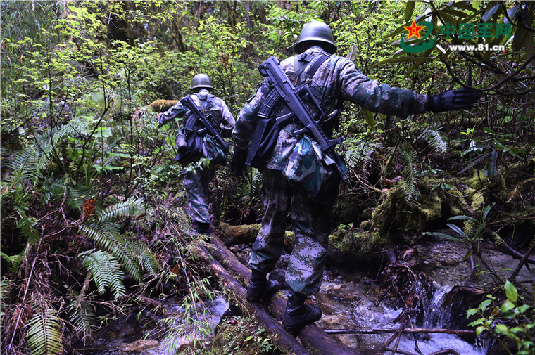巡邏官兵踏碎石、踩枯木,謹慎前行。李 斌攝