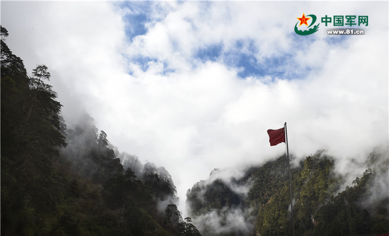 西藏軍區(qū)某邊防團(tuán)一連駐地,鮮艷的五星紅旗迎風(fēng)招展,蜿蜒的河水奔涌而去,墨綠色林海雨霧繚繞,與遠(yuǎn)處的雪山遙相呼應(yīng)。