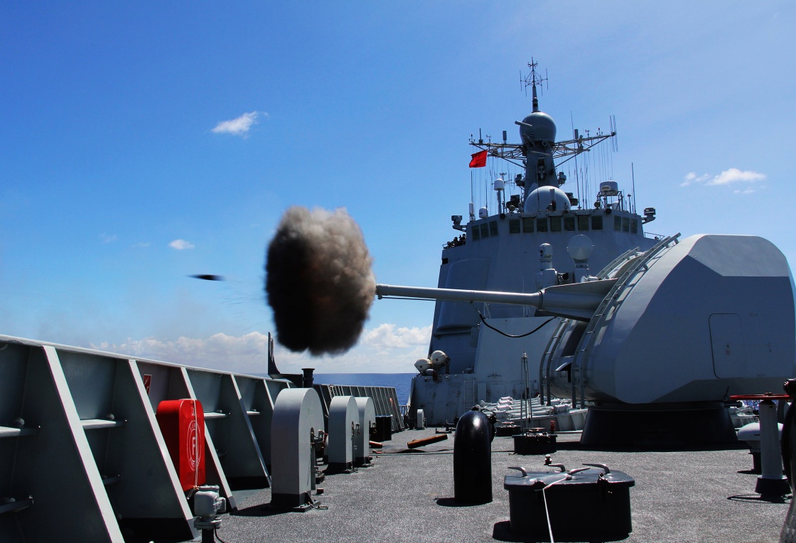 在多國聯(lián)演任務中,海口艦進行主炮射擊(2014年6月19日攝)。新華社發(fā)于林攝