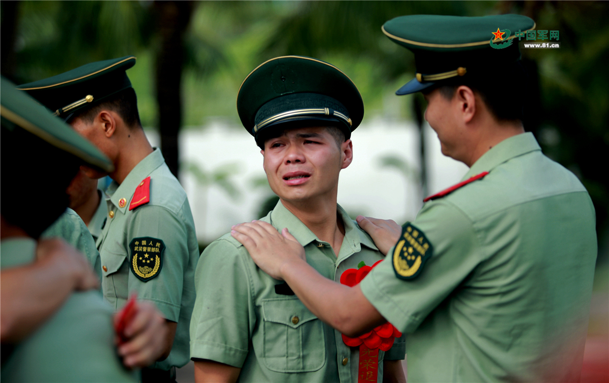 退伍儀式上,老兵與留隊(duì)?wèi)?zhàn)友揮淚告別。