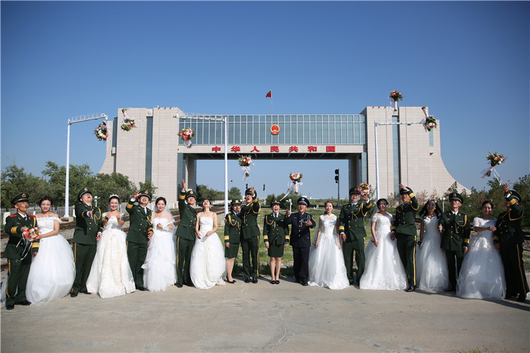 八一建軍節(jié)當(dāng)天,二連邊防檢查站官兵在國門前舉行集體婚禮。新華社記者丁鵬攝