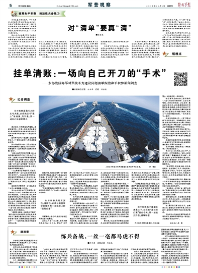 列出問題清單,歸根結(jié)底是為了開展“清零行動(dòng)”,必須持續(xù)解決問題。今天出版的《解放軍報(bào)》為您帶來東部戰(zhàn)區(qū)海軍對(duì)照戰(zhàn)斗力建設(shè)問題清單糾治和平積弊的新聞?wù){(diào)查——