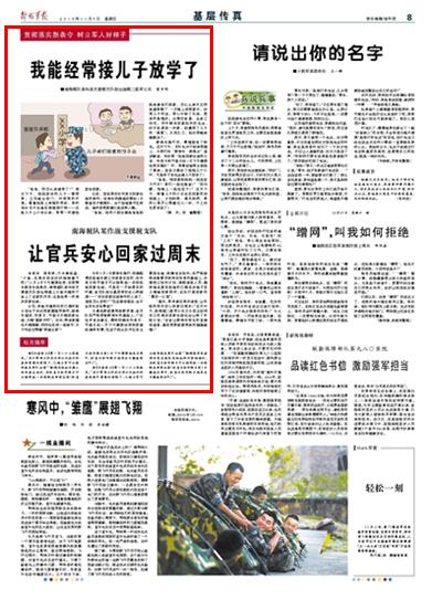 今年5月1日新條令施行,明確配偶在駐地長期工作或者生活的,在休息日和節(jié)假日可以按照統一安排輪流回家住宿。南海艦隊某作戰(zhàn)支援艦支隊在嚴格貫徹新條令的基礎上,合理制訂輪休計劃、調配值班人員,切實打通回家的“最后一公里”。詳情請關注今天出版的《解放軍報》帶來的報道——