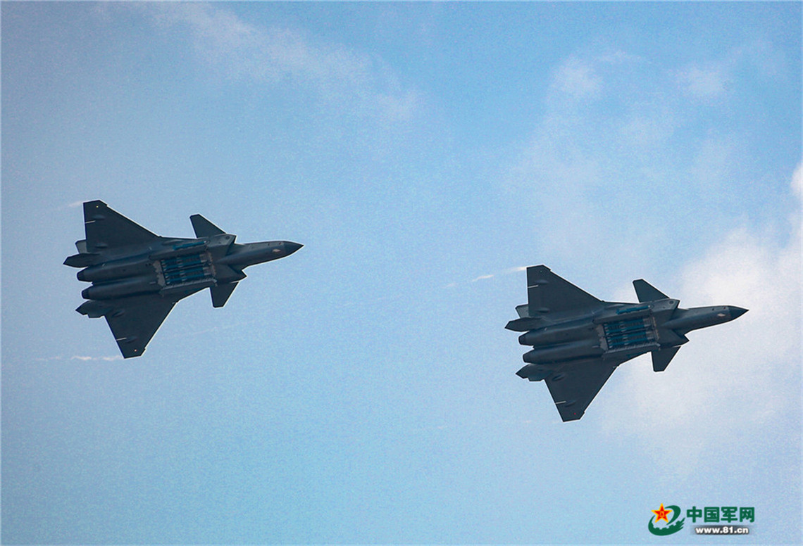 殲-20雙機(jī)同時打開殲內(nèi)置的主彈倉和進(jìn)氣道側(cè)面的側(cè)彈倉。中國軍網(wǎng)記者 馮開華 攝