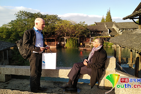 夕陽的余暉下,兩位參會(huì)的外國(guó)專家在烏鎮(zhèn)小橋上交談。中國(guó)青年網(wǎng)記者 楊月 攝