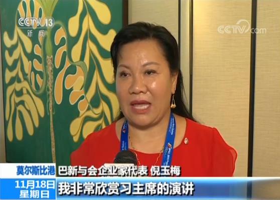 巴新與會企業(yè)家代表倪玉梅:“ 我非常欣賞習(xí)主席的演講,他說我們要互幫互助,巴布亞新幾內(nèi)亞是一個非常小的國家,但是中國政府平等地看待我們,以朋友間的方式幫助我們,巴新正向中國學(xué)習(xí)提升每個人的生活質(zhì)量 實現(xiàn)減貧。”