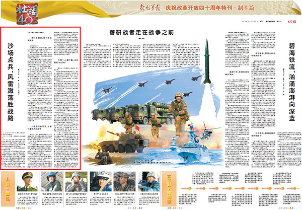 “戰(zhàn)爭(zhēng)就在明天,我們必須快馬加鞭。”站在朱日和高地眺望:從嚴(yán)冬到酷暑,從寒區(qū)到溫區(qū),從高原到海島,從大漠到大洋……縱觀近幾年來我軍的重大演習(xí)演練,不僅覆蓋了全季節(jié)、全天候、全地域,更凸顯全系統(tǒng)全要素參與、戰(zhàn)略戰(zhàn)役力量全覆蓋、陸海空天電全維展開等鮮明的時(shí)代特點(diǎn)。請(qǐng)關(guān)注今天出版的《解放軍報(bào)》“慶祝改革開放四十周年特刊·制勝篇”發(fā)表的文章——
