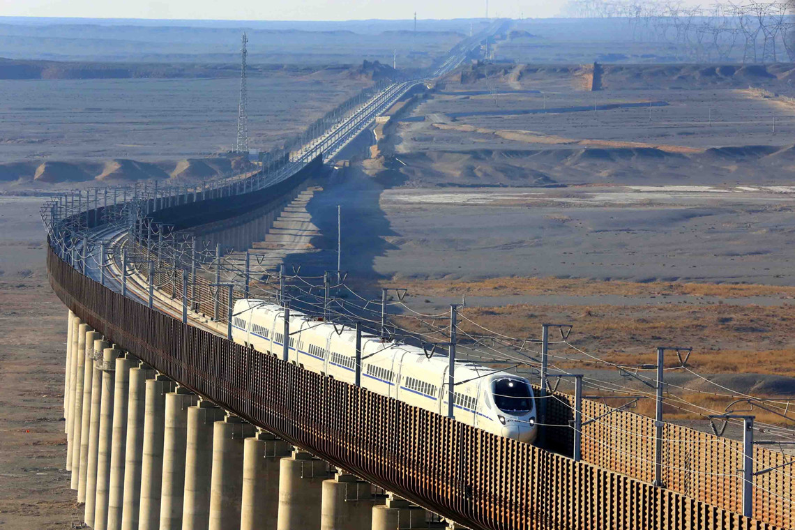 2014:新疆,一列動車從蘭新高鐵哈密淀泉特大橋上駛過。蘭新高鐵是世界上第一條高原高鐵。