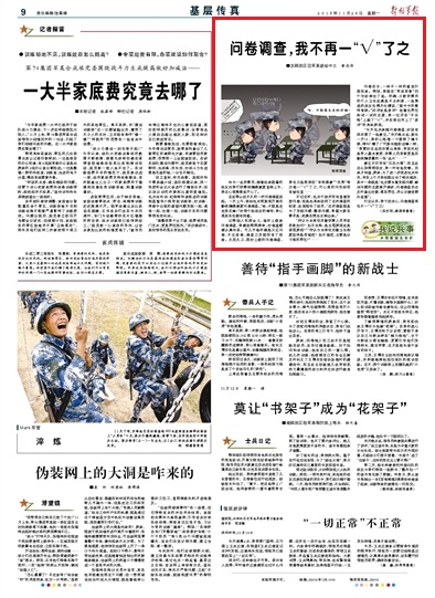 “你認(rèn)為本單位后勤炊事人員軍容形象如何?如不合格,是主觀原因還是客觀原因?”“你認(rèn)為本單位后勤衛(wèi)生制度堅持是否規(guī)范?如不規(guī)范,主要是以下誰的責(zé)任?”……問卷在手,一種不一樣的感覺撲面而來。請關(guān)注今日出版的《解放軍報》——