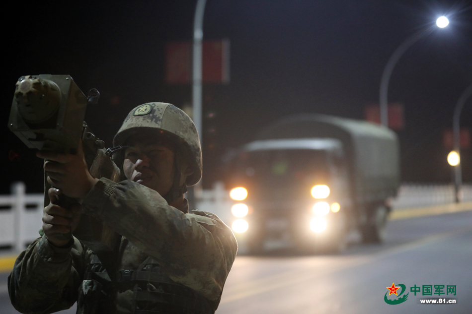 夜幕降臨,隨行防空兵利用某型防空導(dǎo)彈對(duì)空實(shí)施警戒。